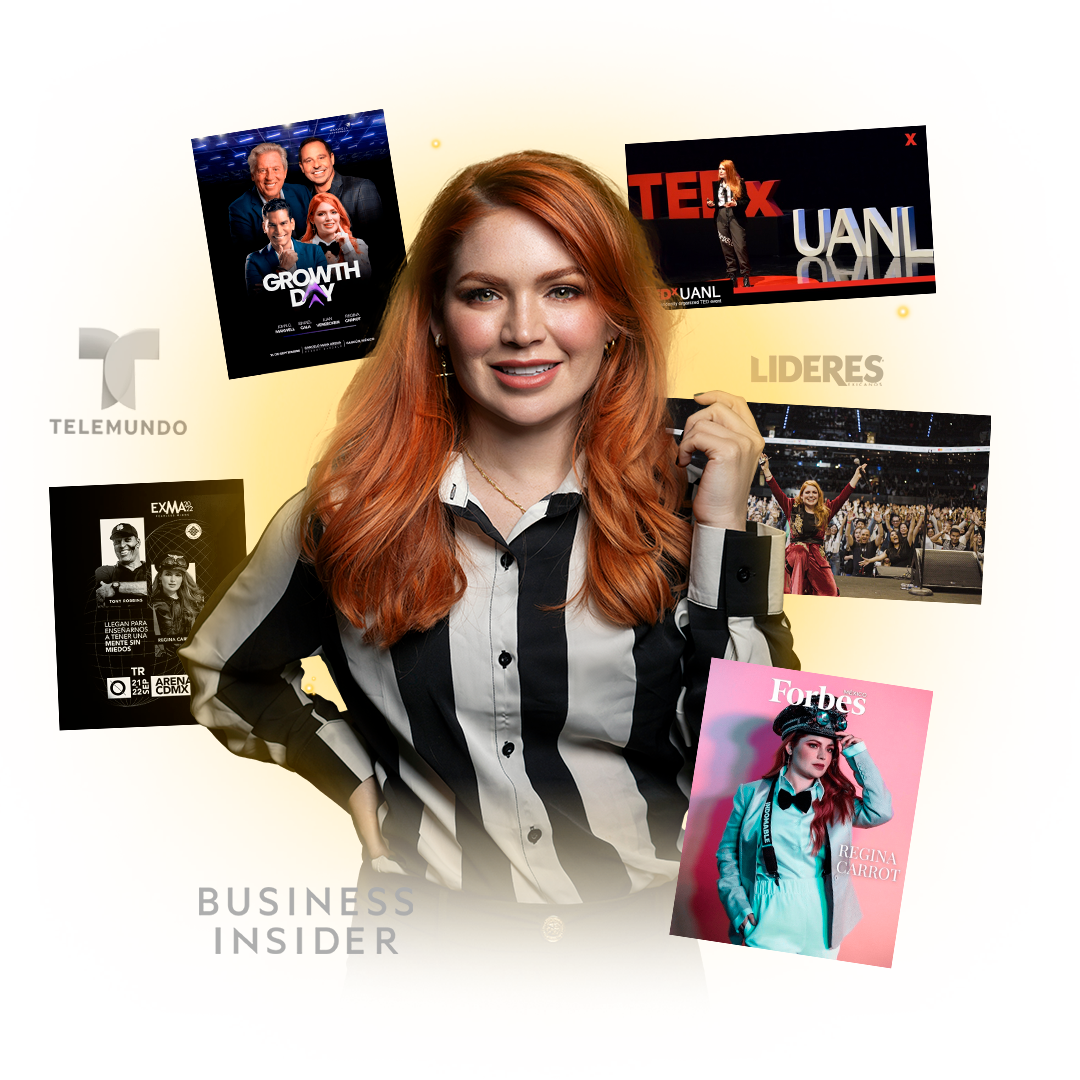 Soy Regina Carrot, conferencista internacional, TEDx Speaker, autora de Speaker Master, autora del libro Conquista y Magnetiza tu Voz, CEO y fundadora de Speaker Magnética Academy para ayudar a mujeres profesionistas, dueñas de negocio y altas ejecutivas a convertirse en desarrollar su ecosistema para rentabilizar su voz como Speakers. Con +14M seguidores y escenarios compartidos con Tony Robbins, John Maxwell y Grant Cardone.